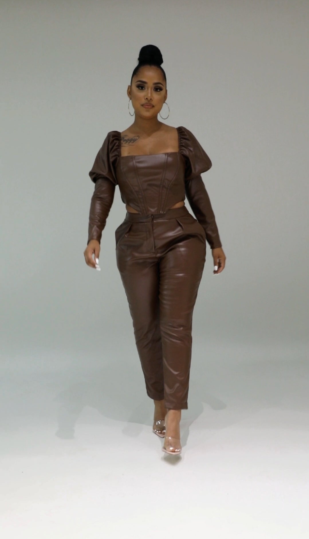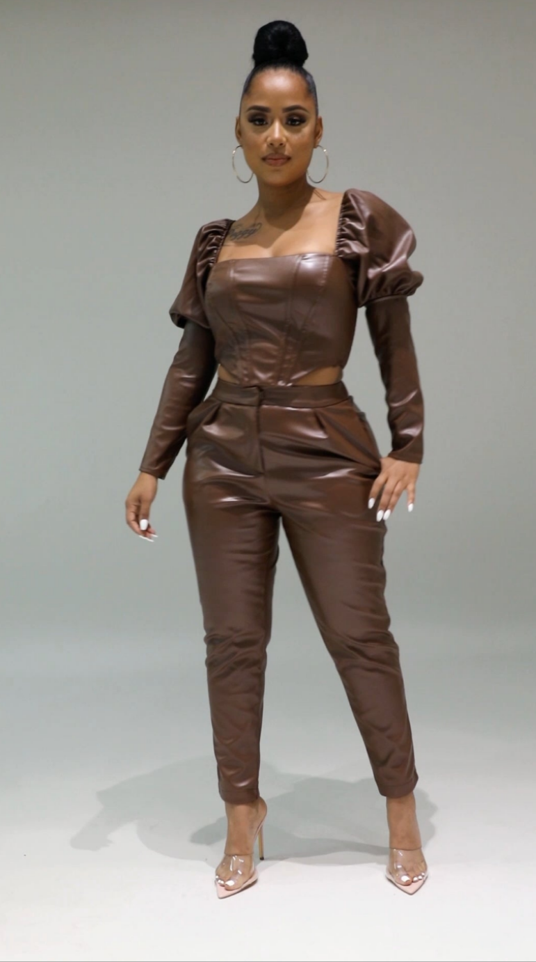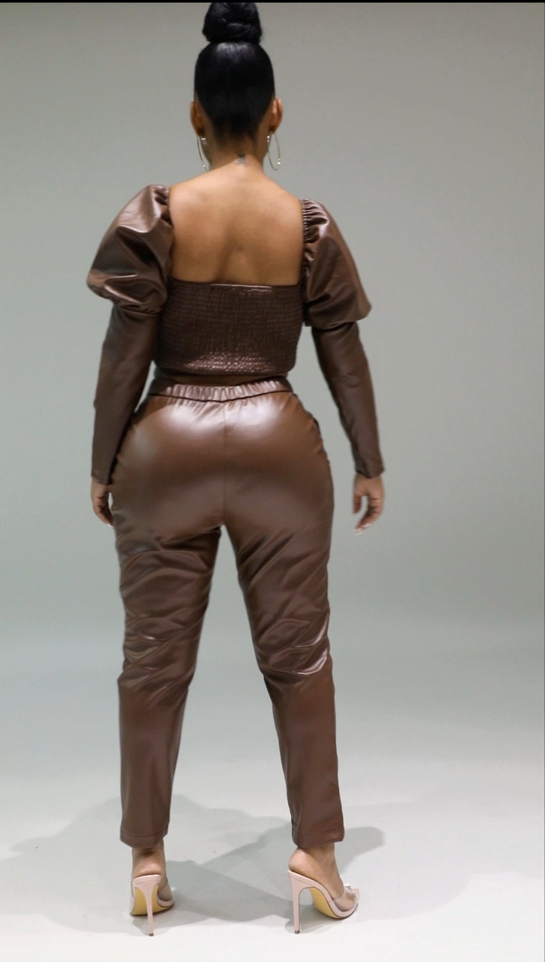 BROWN PEPLUM SLEEVE FAUX LEATHER TOP